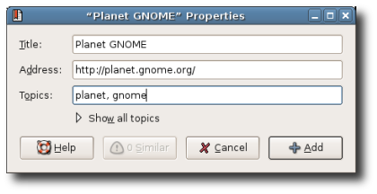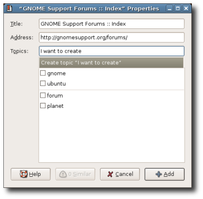 You can type your tags. If the topic doesn’t already exist, a dropdown menu will appear and allow you to create it. You can also simply choose in the existing topics list. Based on your bookmarks’ list, Epiphany will try to guess which topics you would choose and put them at the top of the list. In this case, Epiphany suggested the topics « Gnome » (which is good) and « Ubuntu » (which is wrong).