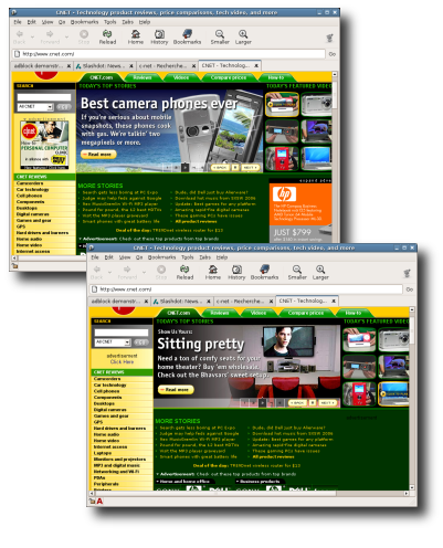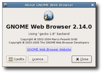 Epiphany uses the latest version of the Gecko engine also used by Firefox 1.5. It closely follows the W3C standard and allows a lot of nice things like out-of-the-box SVG support, totem plugin for multimedia contents, …