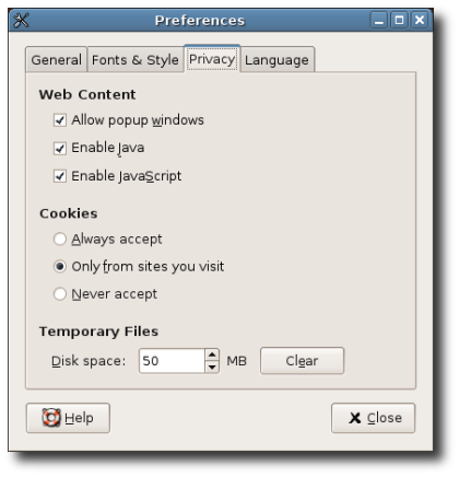 There’s no need for hundreds of options and two hours of tweaks before your browser is ready for use. Epiphany works perfectly out of the box and offers an easy, and yet quite complete, options dialog. Your mother will eventually be able to configure her browser herself.