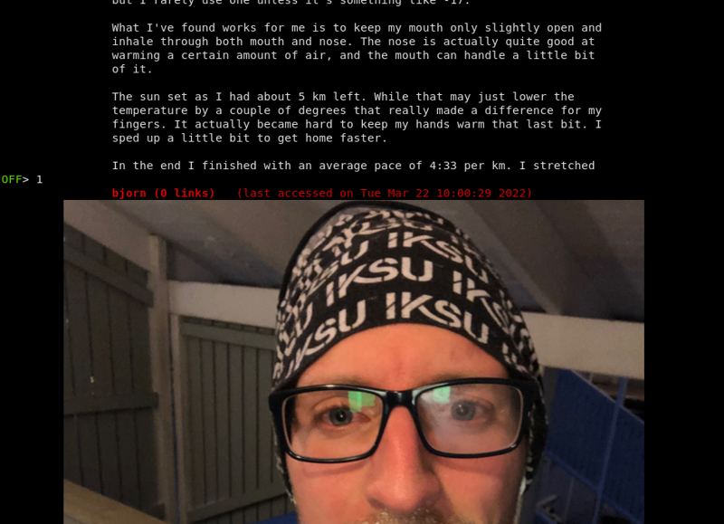 With Offpunk, I still can read people I like on the web. I follow their RSS feeds. It makes me feel like I’m still on Gemini or Gopher. It’s funny how, each time I find something deep and meaningful to read on the web, it renders well in Offpunk. It feels a bit like meaning and technical presentation are somehow connected.