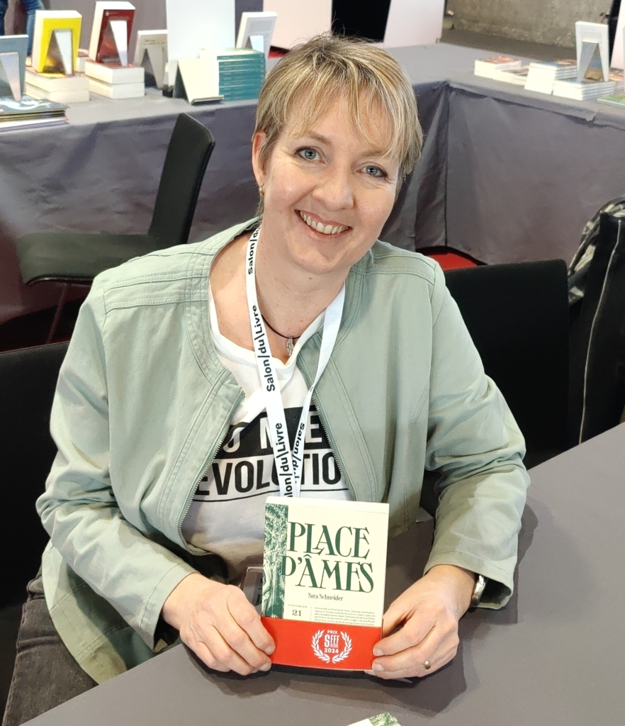 La star de la table sera sans conteste Sara Schneider, autrice fantasy de la saga des enfants d’Aliel et qui est toute auréolée du Prix SFFF Suisse 2024 pour son superbe roman « Place d’âmes » (dont je vous ai déjà parlé).