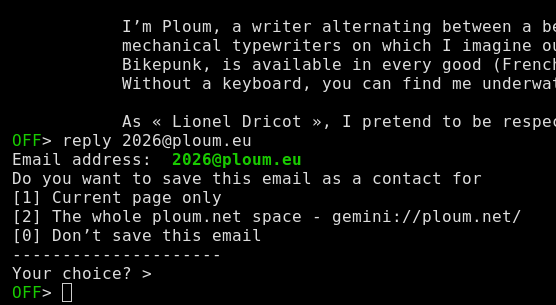 Reply will try to find a mailto link by exploring the page, root pages and, since 3.1, potential "contact" pages. It sometimes works really well. Often, the mail address is obscured or hidden. That’s not a problem. You only need to find it once because Offpunk allows you to save it for the page or the whole online space.
