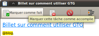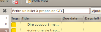 Pour chaque papier, chaque idée, chaque mail, je rajoute une action dans GTG en utilisant la barre d’ajout rapide. C’est rapide et efficace, c’est fait pour après tout.