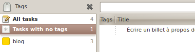 Ensuite, toujours dans GTG, j’affiche la liste des tâches qui n’ont pas de tag. Ce sont en effet des tâches que je n’ai pas encore triées. Si je veux ajouter directement un tag à une série de tâches que j’ajoute, je me positionne, dans GTG, sur le tag en question. Toutes les nouvelles tâches auront immédiatement ce tag.