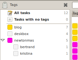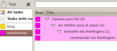 Lorsque les sous-tâches doivent se suivre (par exemple : acheter le cadeau, emballer le cadeau, le mettre sous le sapin), je rajoute toutes ces tâches d’un coup dans la tâche parent (cadeau de Newtonmas). Ensuite, par glisser-déposer, je fais en sorte que « acheter le cadeau » soit la sous-tâche de « emballer le cadeau », elle-même sous-tâche de « placer le cadeau sous le sapin » elle même sous-tâche de « cadeau de newtonmas ». GTG manque d’un moyen rapide d’ajouter des tâches qui dépendent l’une de l’autre[3] mais le glisser-déposer reste malgré tout rapide et suffisament efficace.