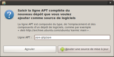 La première chose à faire est donc d’installer Getting Things GNOME![1]. Si vous utilisez Ubuntu Karmic, ajoutez le dépôt ppa:gtg/ppa dans vos sources de logiciels (Système > Administration > Sources de logiciels puis onglet « Autres logiciels » et bouton « Ajouter »). Dans le même menu Administration, lancez le gestionnaire de paquet Synaptic et installez « gtg ».