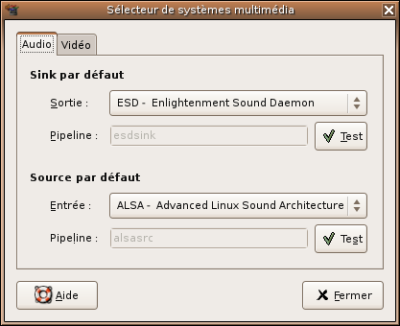 Le sélecteur de systèmes mutlimédia, dans les préférences, permet de choisir quelle sortie on veut que les applications GStreamer utilisent : OSS, ALSA, ESD.