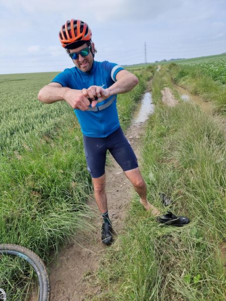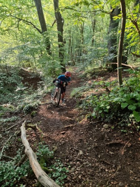 Le temps de me présenter sa config bikepack (il a notamment troqué le Camelbak sur le dos pour une ceinture porte-gourde) et nous voilà partis. À peine sorti des routes de Genappe et nous sommes confrontés à des chemins qui viennent de vivre deux mois de pluie quasi permanente. Cela signifie d’énormes flaques et une végétation plus qu’abondante. J’avais été témoin, sur mes sentiers habituels, de chemins se refermant complètement en trois ou quatre jours de beau temps après des semaines de pluie.