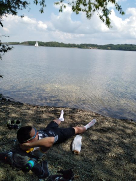 Juste avant le barrage de la Plate Taille, nous bifurquons vers une zone de balade autour du lac. Nous nous planquons dans un petit bosquet où, malgré les panneaux d’interdiction, j’enfile un maillot pour profiter d’une eau délicieuse à 19°C. Sur la rive d’en face, je pointe l’endroit où Loïc a fait son baptême de plongée en ma compagnie.