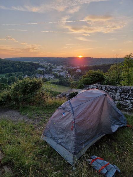 J’hésite. Nous sommes sur une propriété privée. L’à-pic n’est pas loin. Les sardines ne se planteront peut-être pas dans la terre fine de la terrasse. Mais je vois les yeux de Loïc pétiller. Je propose de tester de planter une sardine pour voir si c’est faisable. Loïc propose une manière de disposer les deux tentes sur la terrasse de manière à être le plus éloigné possible du trou. Nous finissons par retourner aux vélos, décrocher tous les sacs pour les amener sur notre terrasse. Il reste à faire passer les vélos eux-mêmes par le même chemin. C’est acrobatique, mais nous y arrivons et bénéficions d’un coucher de soleil sublime alors que nous montons nos tentes.