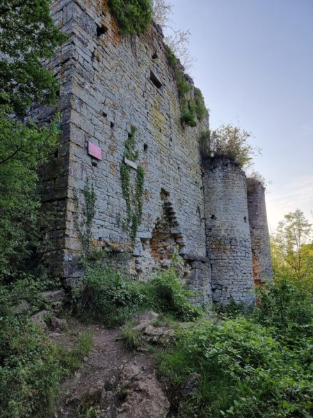 Les ruines de la tour moyenâgeuse se dressent devant nous. Après cet effort, Loïc décide qu’il a bien mérité de contempler la vue. Il contourne la tour par un étroit sentier qui nécessite même un mètre d’escalade sur le mur médiéval. J’hésite à le suivre puis me laisse gagner par son enthousiasme.