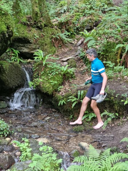 Alors que j’ai un excellent rythme, une pause impromptue s’impose, le lieu me subjuguant par la beauté un peu irréelle d’une petite cascade. Je m’arrête et m’offre un bain de pieds tandis que Loïc prend des photos. Une fois sortis des gorges de la Lesse, nous nous arrêtons pour étudier la situation.