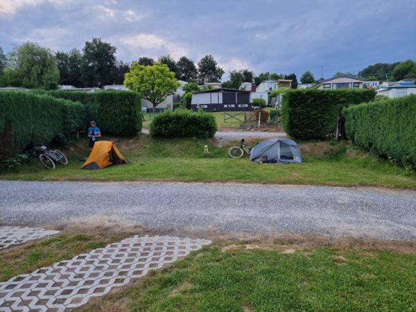 Après le repas, nous sautons sur nos montures pour gravir ces 2 derniers kilomètres, le camping étant sur une hauteur. Rasséréné par la certitude d’avoir un logement et le ventre plein, Loïc me lâche complètement dans la côte. Son enthousiasme est multiplié, car il reconnait le camping. C’est une constante de ce tour : alors que je cherche à lui faire découvrir des choses, il reconnait sans cesse les lieux et les paysages pour y être venu à l’une ou l’autre occasion. Parfois même avec moi.