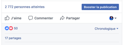 Malgré 50 « J’aime » et 17 partages (ce qui est pour moi un véritable succès), le nombre de « personnes atteintes » est à peine le nombre de personne qui aime ma page. Et, par « personne atteinte », Facebook veut dire « personne pour laquelle ma publication s’est affichée dans le flux ». Cela ne signifie pas que la personne a vraiment vu ma publication et encore moins qu’elle l’aie lu.
