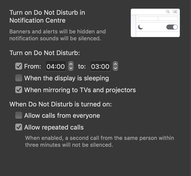 Au fait, mon ordinateur est en permanence en mode Do Not Disturb. Je sais bien que MacOS ne permet pas d’être en permanence dans ce mode mais il permet de fixer Une plage horaire. La mienne s’étant de 4h du matin à 3h du matin. En théorie, entre 3h et 4h, je recevrai les notifications mais je suis rarement devant mon ordinateur à cette heure là.