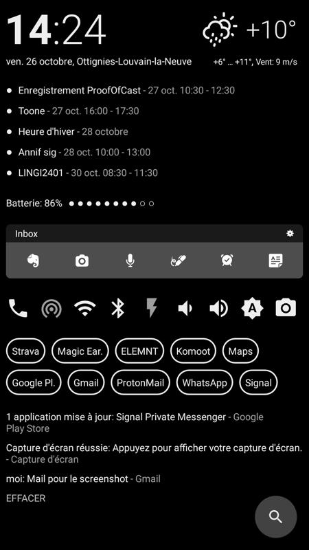 J’ai activé les notifications pour les applications suivantes : mail, Whatsapp, Signal et agenda. J’avais initialement désactivé les mails mais, du coup, à chaque fois que je regardais mon téléphone, je lançais l’app. Désormais, un coup d’œil me permet de voir si je dois traiter quelque chose. Tout le reste est en théorie désactivé. Grâce à un bouton hardware, le téléphone est en permanence en silencieux sauf si j’attends un coup de fil. Je ne mets donc pas mon téléphone en silencieux, c’est le contraire : je le mets en mode bruyant lorsque j’en ai besoin. Conséquence directe : je ne vois les notifications que sur l’écran et seulement si je le consulte volontairement. Elle ne m’interrompent pas.