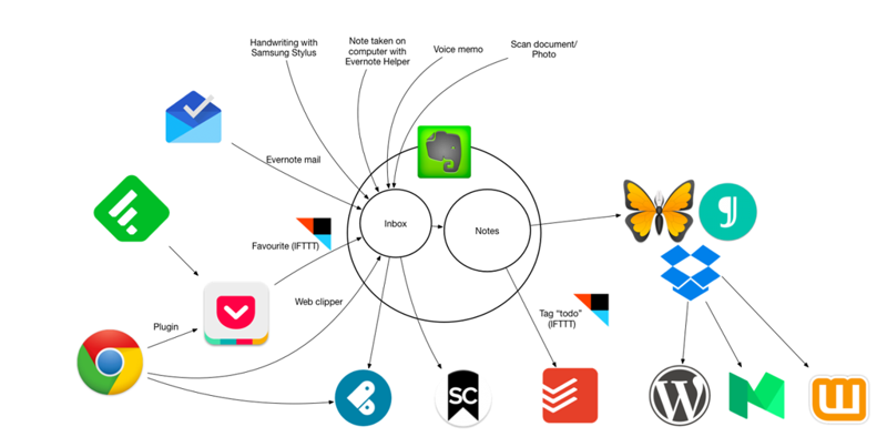 Ce qui est primordial, c’est de séparer complètement l’acte de saisie et celui de trier/traiter. Par définition, je ne réfléchis pas et toutes mes idées, mes notes, mes actions à faire plus tard va dans mon inbox Evernote sans que j’ai besoin de réfléchir.