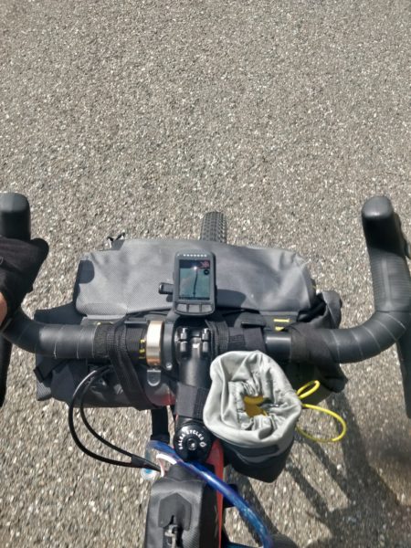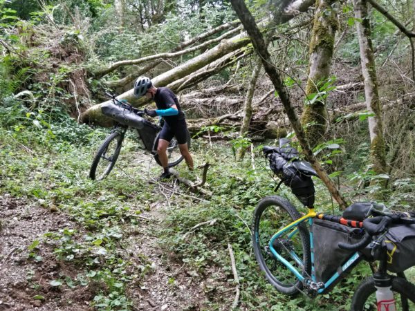 Une des attaches de mon sac de guidon Apidura se rompt. Je suis déçu par la fragilité de l’ensemble. Thierry me confie qu’ils n’ont sans doute jamais fait de VTT chez Apidura. Lui-même a du pas mal bricoler son sac pour l’attacher. Avec un sac bringuebalant, le calvaire risque de se transformer en enfer. J’ai heureusement une illumination : j’ouvre le sac et m’empare de la ceinture de mon bermuda civil avec laquelle je fabrique une fixation qui se révélera bien plus stable et solide que l’attache originale. Nous repartons.