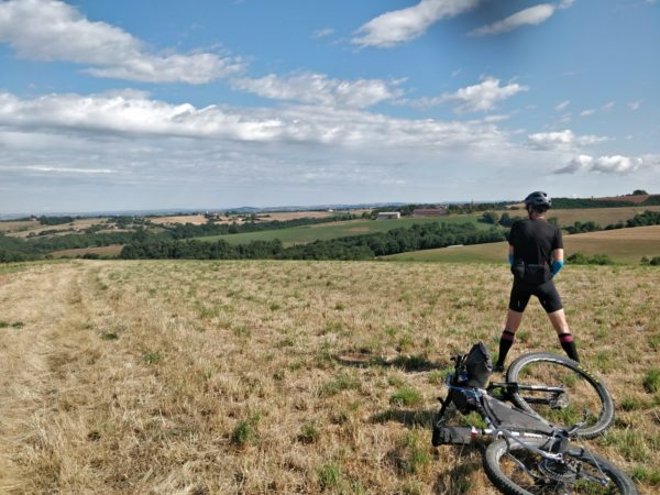 Chaque jour se révèle fondamentalement différent. Alors que nous avions eu de la garrigue, des petites buttes sèches et de la caillasse le premier jour, des creux et des bosses vallonnées emplies de végétation le second jour, voici que les chemins se transforment en maigres routes, que les bosses se font plus pentues mais plus roulantes. Je suis dans mon élément, je roule, je prends du plaisir à escalader toutes ces pentes qui me semblent désormais courtes mais qui sont plus longues que tout ce que j’ai jamais fait autour de chez moi. Nous descendons à toute allure vers Albi, les kilomètres défilent. Thierry est moins à l’aise : si son VTT avec suspension à l’avant le faisait flotter dans la caillasse, il lui donne l’impression de coller au bitume. Mais les chemins sont encore nombreux. Les paysages sont sublimes, la civilisation est désormais omniprésente. Nous ne faisons que la contourner mais sa présence rassurante flotte autour de nous, spectre ricanant à notre naïve tentative de lui échapper.
