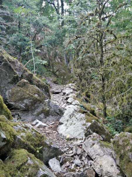 D’ailleurs, au détour d’un virage, il se termine abruptement par des masses d’arbres abattus. Pas moyen de passer. J’aperçois, en contrebas, ce qui semble être la continuation du chemin. Nous traversons quelques dizaines de mètres de végétation pour le rejoindre avant de continuer. Après plusieurs centaines de mètres, flagellés par les ronces et les branches basses, nous avons la certitude d’avoir mis plus d’une heure pour contourner la maison de cet antipathique anachorète. Il nous faut désormais sortir du trou, escalader la paroi opposée.