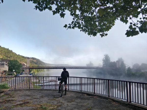 Départ du lac de Vézoles. Petit-déjeuner prévu dans 13km à La Salvetat-sur-Agout. Une paille. Surtout que ça va descendre. Je pars à jeun. Grave erreur. La trace se perd dans des pistes noires VTT. Des montées et descentes infinies de pierrailles, du type de celles qu’on voit sur les vidéos Youtube de descente en se demandant « mais comment ils font ? ». Avec un vélo tout rigide chargé de sacs, le chemin tient du calvaire.