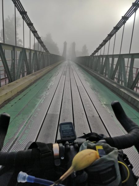En plus des traditionnels pains au chocolat, le magasin dispose de quelques fruits. Je prends deux abricots et une banane. Des fruits sans saveur qui me sembleront délicieux avant de traverser un étroit pont, magnifique dans la brume, et de continuer à pédaler dans le froid.
