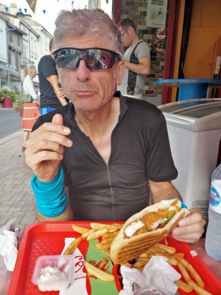 Marmande est une ville morte le 15 août. Tout semble fermé. Tout est sale, craignos. On croise un camping car et une voiture de l’équipe nationale belge de cyclisme. Je reconnais Rick Verbrugghe au volant. Je découvre que le tour de l’avenir partait aujourd’hui de Marmande. Cela ne semble pas avoir laissé la moindre gaité. Nous repérons une sorte de boulangerie puis un petit snack crado. Nous espérons trouver mieux. Tout est fermé. Une brasserie propose une carte alléchante. Mais pas de surprise : nous ne sommes pas dans les heures pour commander à manger. Nous retournons vers la boulangerie qui se révèle presque vide.