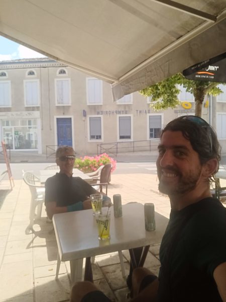 Thierry avait émis l’idée de s’arrêter chez mes cousins et de faire, symboliquement, les derniers kilomètres jusqu’à l’Atlantique le lendemain. Voire de pousser jusqu’à Arcachon. Son fessier n’est plus de cet avis. Nous prenons un thé glacé dans une terrasse du bourg et nous décidons de pousser jusqu’à la mer avant de revenir, de cloturer notre raid aujourd’hui.