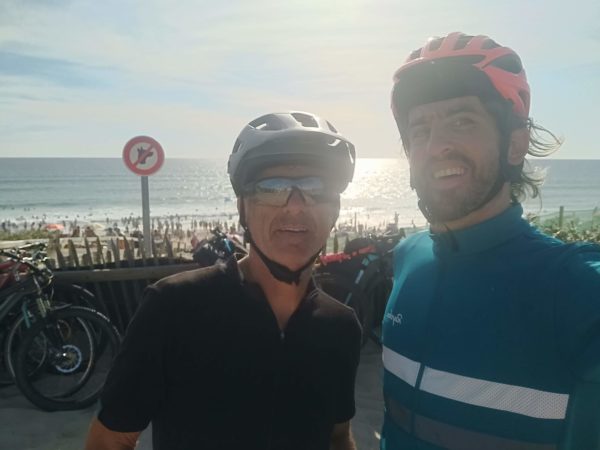 Nous repartons par la piste cyclable, que je connais pour l’avoir empruntée lors de mes visites précédentes. Malheureusement, je n’étais jamais venu en août et je suis sidéré par la foule de vélo chargés de parasols et de matelas pneumatiques qui l’encombre. Elle se révèle aussi plus longue que dans mes souvenirs. Heureusement, elle est également vallonnée, ce qui me procure un certain plaisir. Dans la bosse la plus raide, un jeune vététiste en tenue du club d’Arcachon et son père tentent de nous dépasser. J’ai beau avoir 120km au compteur et 10kg de sacs, je refuse de laisser filer. Je règle le fils tandis que Thierry règle le père. À une dizaine de mètres du sommet, j’entends le gamin gémir et craquer derrière moi. Je ressens une bouffée de fierté parfaitement puérile.