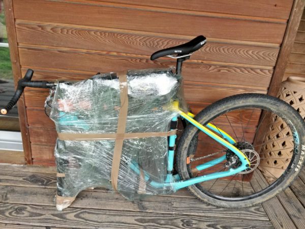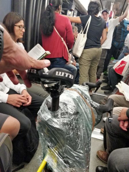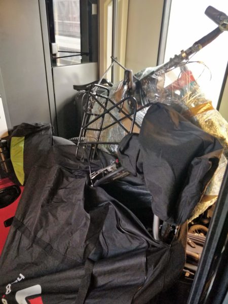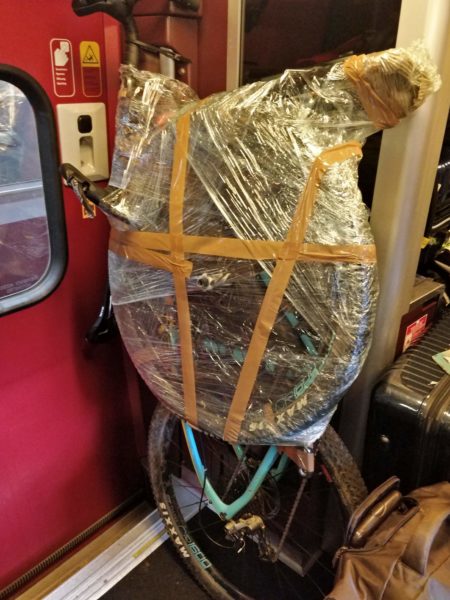 Thierry reprend le train le lendemain, après avoir empaqueté son vélo avec du plastique culinaire. La SNCF annonce avec fracas sur son site que certains TGV permettent de transporter un vélo monté. Je n’en trouve aucun. La mort dans l’âme, je dois me résigner à faire subir à mon fidèle compagnon un traitement qui me fait mal au cœur. Contrairement à Thierry, je ne démonte pas le guidon mais me contente de le tourner à 90°. Une idée de Vincent pour que je puisse facilement transporter mon « paquet » dont une seule roue est encore utilisable.