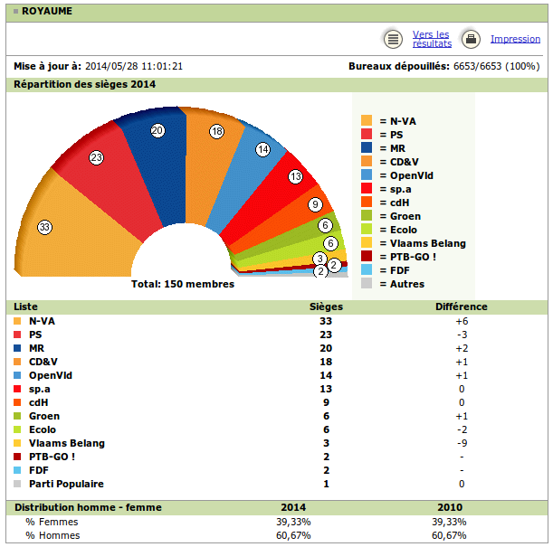 Mon interprétation personelle, si on fait fi de tout jeu politicien, est que le belge veut un gouvernement fédéral de droite libérale (NVA, CD&V, OpenVLD, MR et éventuellement le CDH mais il n’est pas nécessaire) avec une opposition forte à gauche (Socialistes, écologistes et PTB). Je ne peux m’empêcher de penser qu’une cure d’opposition serait une excellente chose pour le parti socialiste qui, quand il est au pouvoir, me semble parfois plus économiquement à droite que bien des libéraux.
