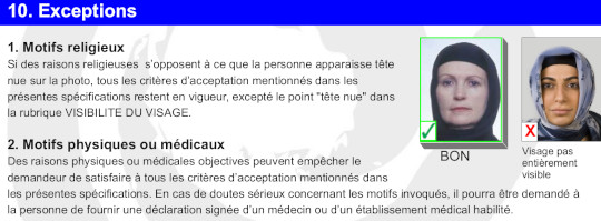 Cette contradiction est visible dans tous les services communaux chargés d’établir nos cartes d’identité : il est en effet stipulé que la photo doit représenter le demandeur tête nue (point 8 du règlement), mais qu’en cas de motif religieux s’opposant à apparaitre tête nue sur nue sur la photo, ce point ne s’applique pas (point 10 du règlement).