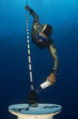 La profondeur donne lieu à plusieurs disciplines, toute pratiquée le long d’un câble vertical. Le poids constant (CWT) est la plus pure : l’apnéiste descend et remonte avec sa palme le long d’une corde qu’il ne peut pas toucher (sauf pour faire demi-tour). La variante sans palme existe bien sûr aussi (CNF). Autre possibilité, l’immersion libre (FIM) : l’apnéiste n’a toujours pas de palme mais peut se tirer le long de la corde.