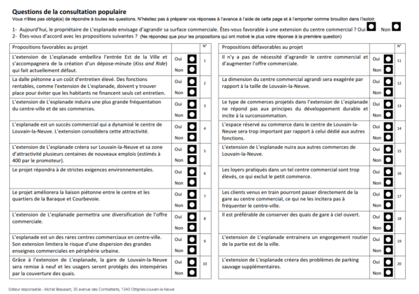 Cependant, un comité de conseillers communaux présidé par Michel Beaussart, échevin de la participation citoyenne, a décidé de rajouter 20 questions sur le bulletin de vote !