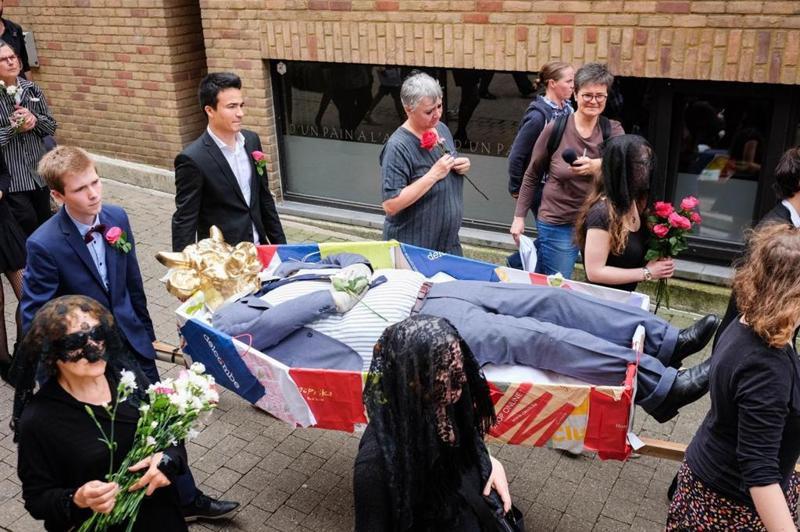 Les citoyens enterrent le veau d’or lors de la parade des utopies.