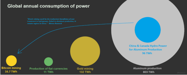 Selon une étude de Bitmex, une grande partie de l’électricité aujourd’hui utilisée dans le Bitcoin serait en fait de l’électricité provenant d’infrastructures hydro-électriques sous-utilisées car initialement dédiée à la production d’aluminium en Chine, production qui a baissé drastiquement suite à une baisse de demande pour ce matériau. Je répète : le Bitcoin a bénéficié d’une grande quantité d’électricité non-utilisée et donc très bon marché, écologiquement comme économiquement.