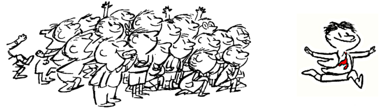 Agnan, il a eu l’air d’hésiter mais le coup de la retenue ça lui a fait plutôt peur. Il faut dire qu’il n’a pas l’habitude Agnan. Alors il a dit que bon d’accord et il est passé tout nu derrière Clotaire. Mais comme il avait oublié ses lunettes, ça n’a pas manqué: il a sonné.