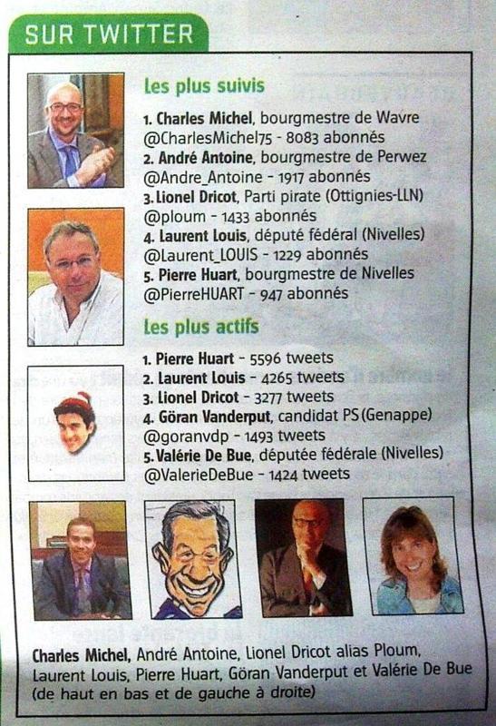 Ainsi, en juillet 2012, le journal l’Avenir décide de faire un classement des politiques du Brabant -Wallon sur Twitter. Surprise, étant candidat aux élections, j’y apparais en troisième position. Or, il est évident que je ne suis pas un politicien influent. La majeure partie de mes abonnés n’ont sans doute jamais entendu parler du Brabant-Wallon. Mais l’observable étant choisie, il faut s’y conformer. Le journaliste a l’intelligence de ne pas faire de commentaire et d’intituler ce classement « Les plus suivis » afin de rester factuel.