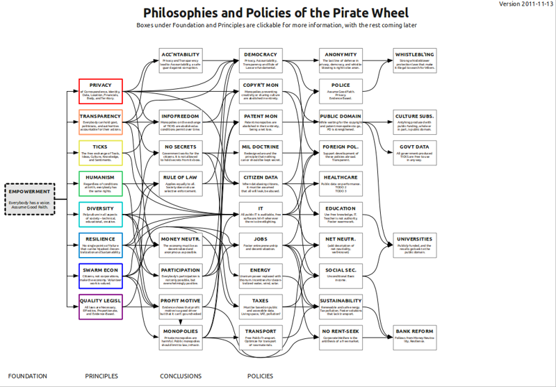 De ce credo du pouvoir rendu au citoyen découlent huit grands principes fondamentaux, regroupés sous l’appellation « La roue des Pirates »[1].