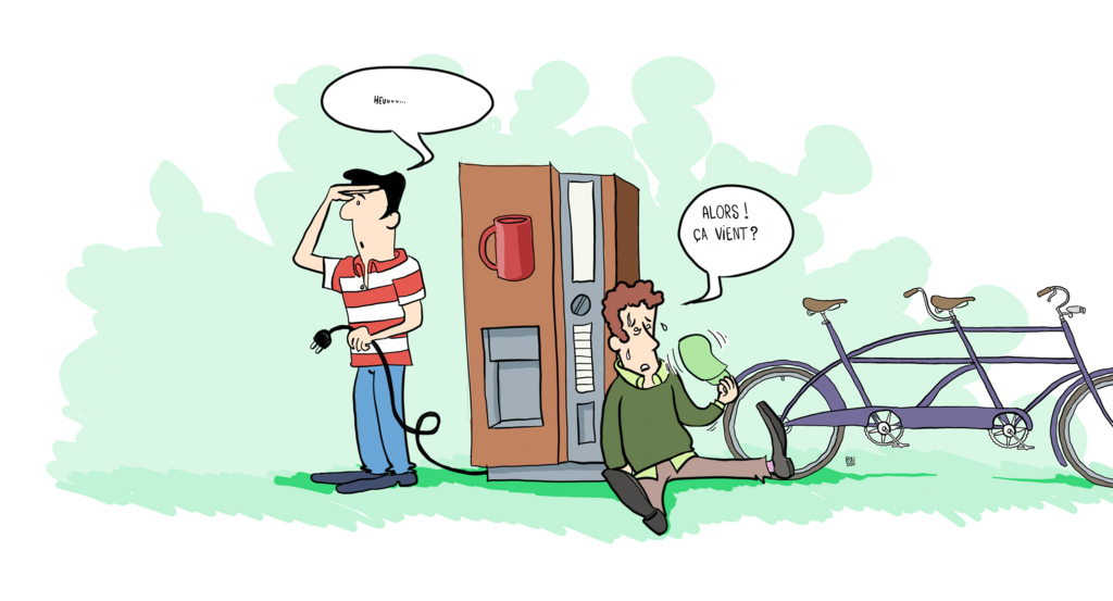 À force de discussions, nous créerons ensemble le webcomic « Les startupeurs » dont j’ai empilé les scénarios avant que, malheureusement, Roudou ne trouve plus le temps pour les dessiner. Des personnages d’employés un peu désabusés (dont l’un est ma parodie selon Roudou), rêvant de créer leurs startup et addicts de la machine à café (une trouvaille de Roudou !).