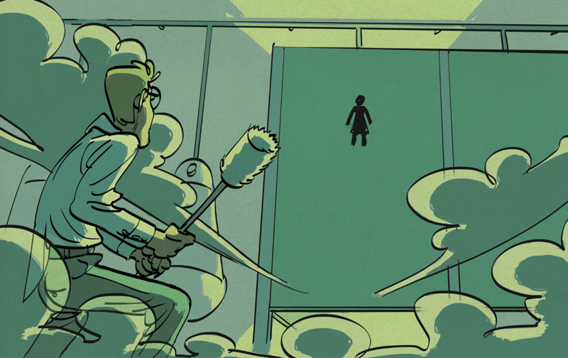 — Tiens, me dit-elle en pointant du doigt une porte munie d’un hiéroglyphe abscons. Au boulot stagiaire ! Montre-nous qu’un homme peut accomplir un véritable boulot de femme !