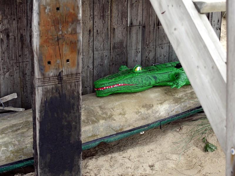 As I went out of the garden shed, dry and fully clothed after hours of swimming, the two children were playing with an inflatable crocodile in the grass. As I was packing my wet swimsuit, I saw one of them putting the crocodile on the water and trying to mount it. The crocodile moved away from the edge of the pool and the young boy silently slipped in the water, exactly under the crocodile.